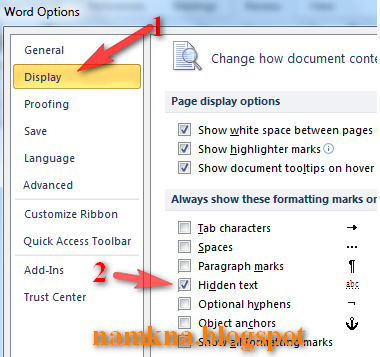 Vào File > Options > Display > tích chọn mục Hidden Text > OK