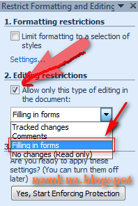 Vào menu Review > Restrict Editing. Ở mục 2. Editing restrictions tích chọn vào Allow only this... chọn Filling in forms. Rồi nhấn Yes, Start Enforcing Protection.
