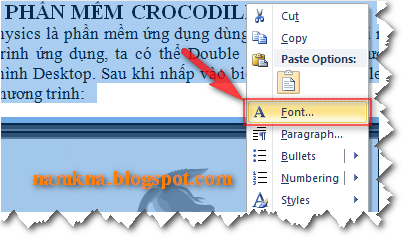 Trước tiên hay Ctrl+A để bôi đen toàn bộ văn bản hoặc bạn bôi đen đoạn không muốn bị in. Click phải chuột chọn Font